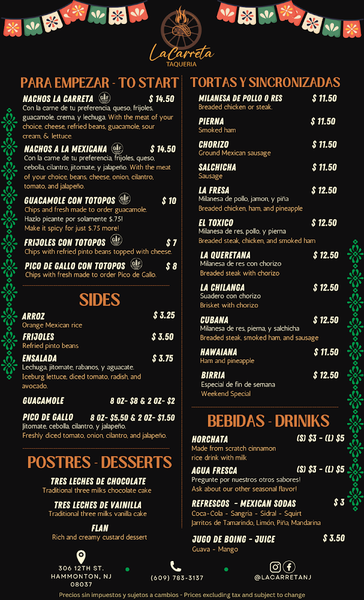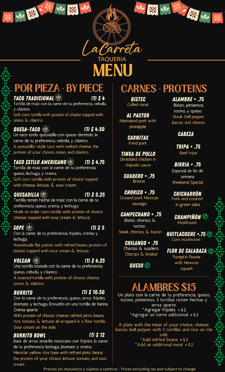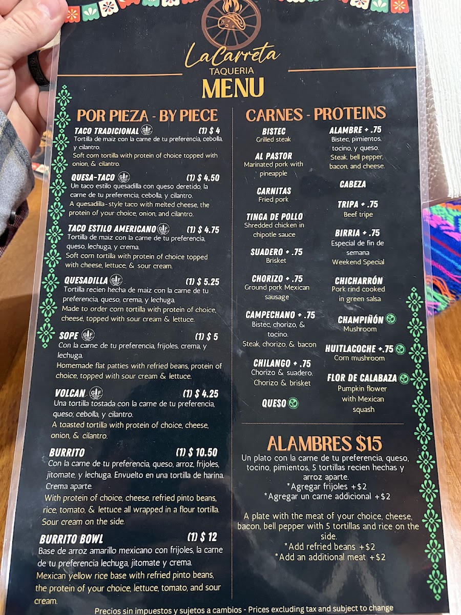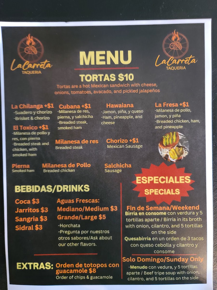La Carreta Taqueria offers a straightforward, inviting menu that reflects the heart of traditional Mexican flavors served in a relaxed, cozy setting. The menu carries a blend of casual bites and hearty options, perfect for a quick lunch, a casual dinner, or a light snack alongside refreshing drinks.